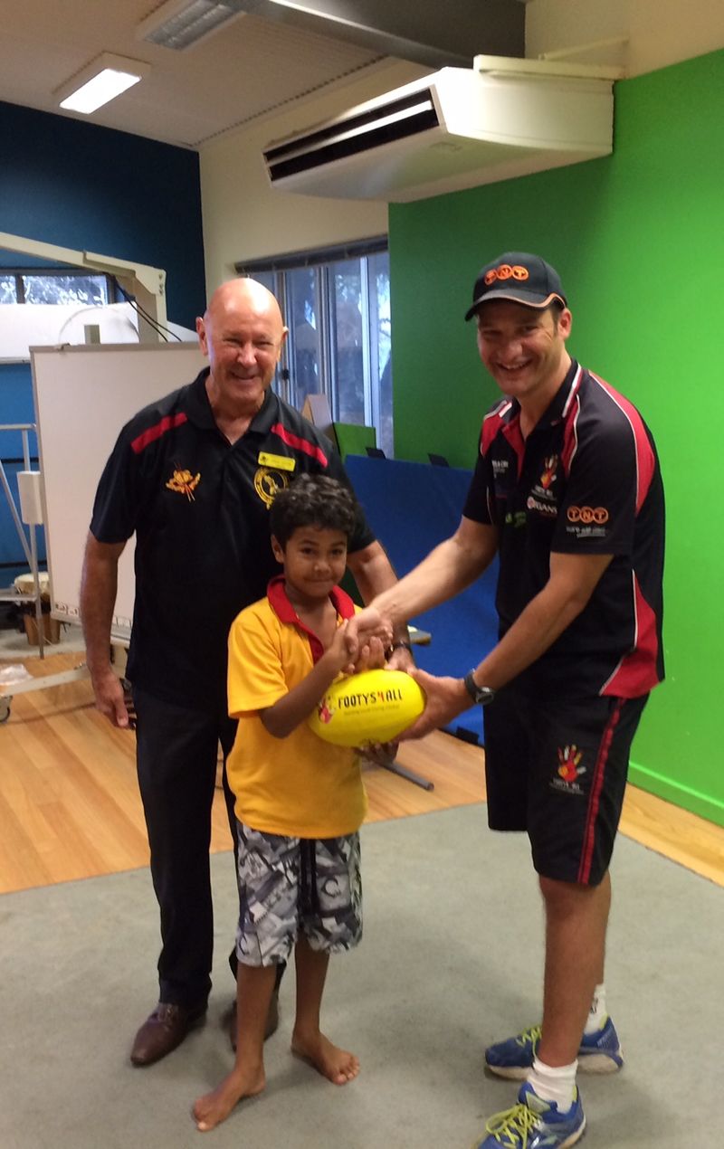 The importance of these football gifts to the recipients could not be more effectively – and dramatically – shown than when, at a Tiwi Island (NT) Footys4All distribution, a young aboriginal child risked his life by jumping into the crocodile-infested waters to retrieve his brand new Ross Faulkner Green Aid Football. That is how much his new football and the opportunity to play sport meant to him! AFL Aboriginal Essendon legend, Michael Long and 4-time World Aboriginal Boxing Champion, Robbie Peden were on hand to help with the event and were amazed and inspired.